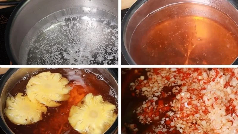 - Pha hỗn hợp đường và nước: Cho đường và một ít nước vào nồi, đun nhỏ lửa đến khi đường tan hết và hỗn hợp sánh lại.